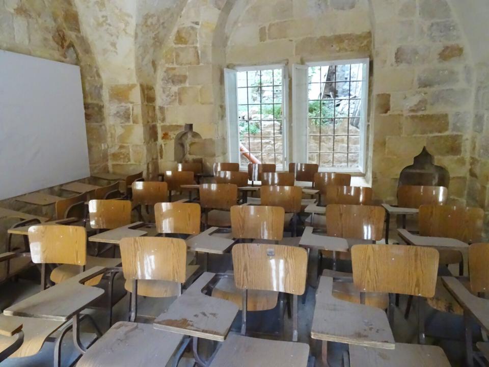 After a few twists through the souk, we left the bustling shops to arrive in front of a green door with a rusted sign swinging above it. Nidal unlocked the door and pushed his way in. We followed him through a low corridor and up some stairs, emerging in a small stone courtyard with a jasmine tree and trash littering the floor. All around were doors, some belonging to residents, others free for us to explore. One room had been converted into a classroom, completely untouched except for a thick layer of dust. We looked out the window and found a huge well, maybe 10 meters in diameter and so deep that we couldn’t see the bottom. “This well used to lead to a river under the city,” Nidal explained. “Now it’s just an entrance to the ruins of the Old City.”
